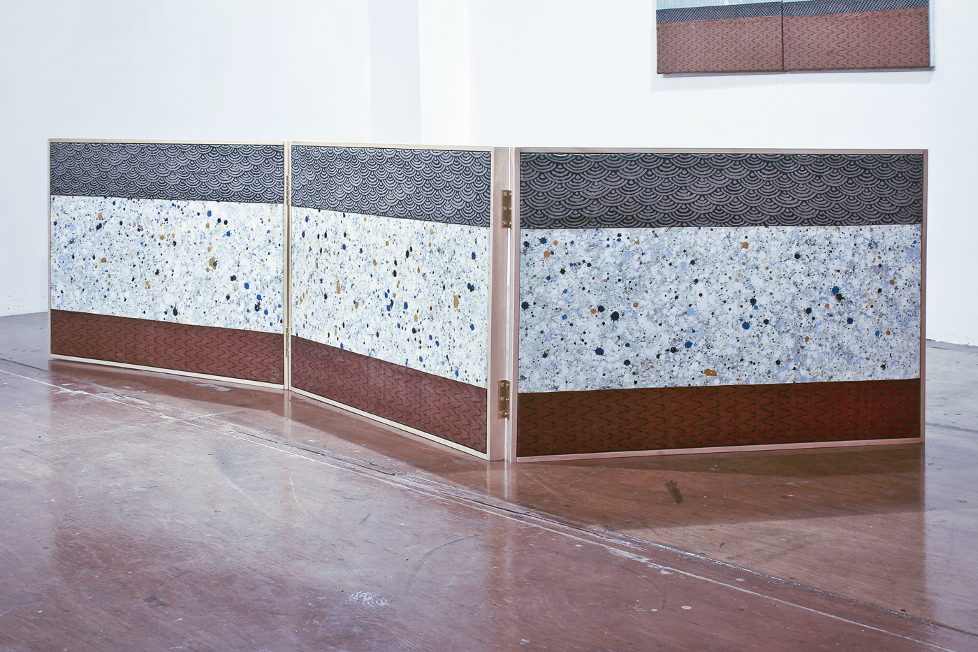 Nympheas Folding Screen (Backside) , 2016. Oil, spray paint, vintage Kimono fabrics on canvas, metal hinges, wood frame, 50 x 80cm x 3