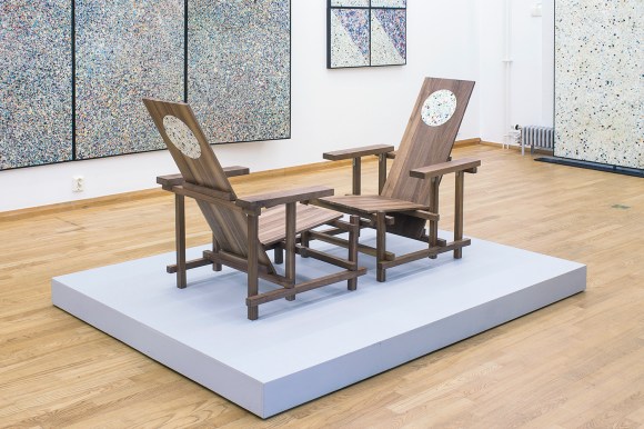 The Merchant, 2016, American walnut, oil, pearlescent pigment, epoxy on canvas mounted on MDF, wooden podium, 86.7 x 66 x 83.8 cm, seat hight 33cm x 2