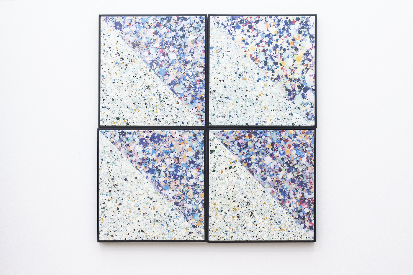 Grid, 2017. Digital print on canvas, oil, pearlescent pigment and epoxy on cotton with wooden frame, 122 x 120 x 4cm