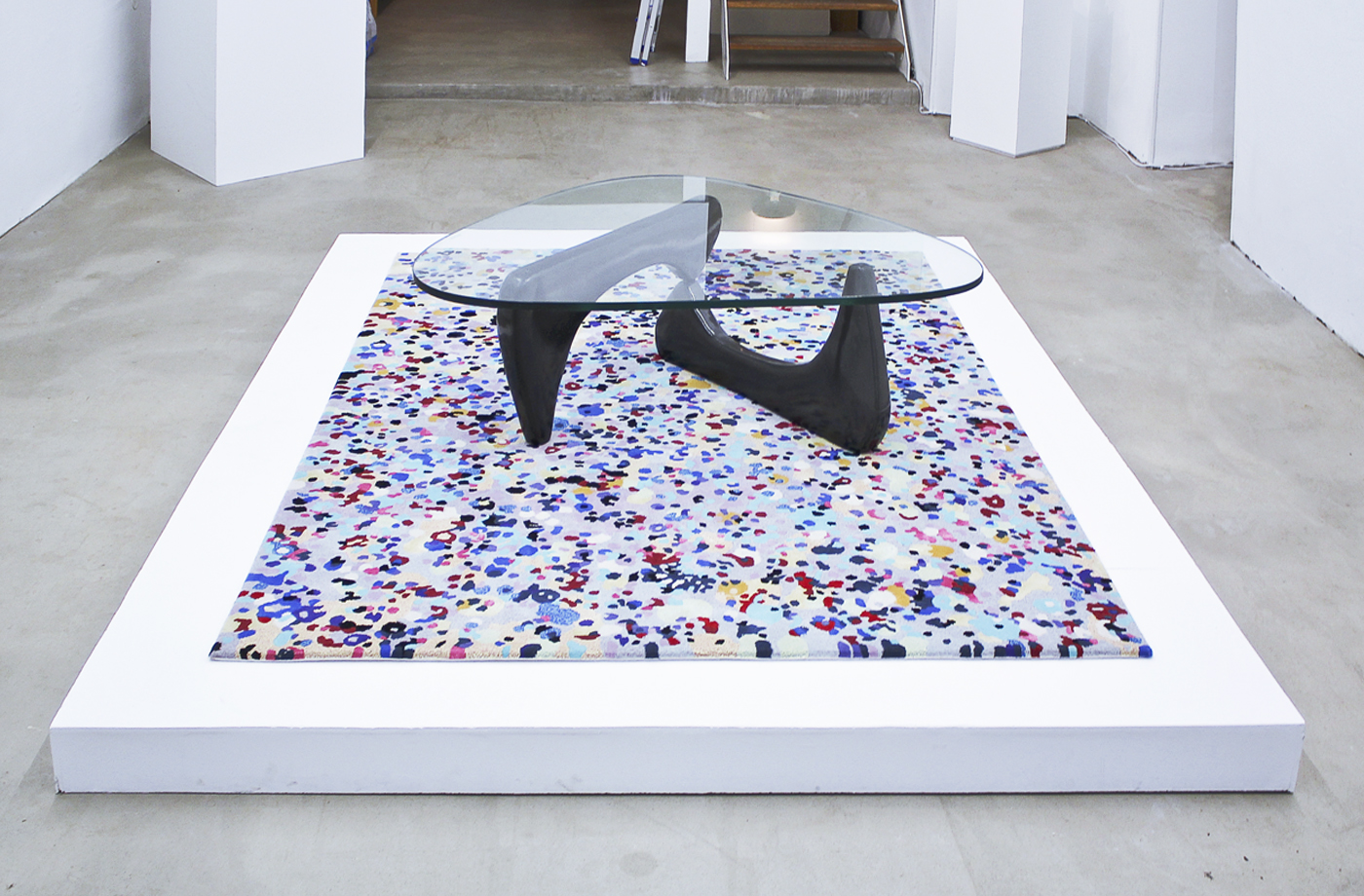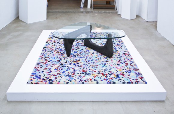Balance, 2016. Styrofoam, epoxy, fiber glass, spray paint, holographic pigment, clear coat, counterfeit glass table top from Shenzhen Yadea Furniture Co.