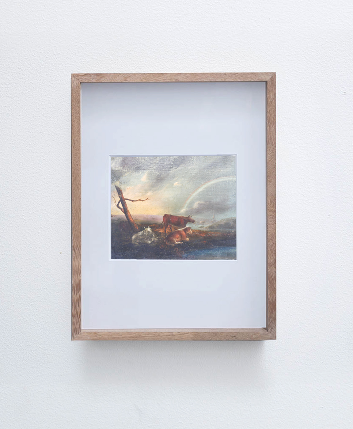 Cattle Resting in a Landscape with Riverside Castle and Rainbow Beyond (Original painting and title), oil on panel, wood frame, size of painting 15x18cm. Approx. 18th century