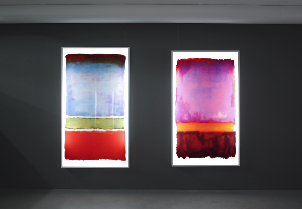 (From left) Aquabluegreenvermilion, 183,6×103,6×15,6cm, Cherryblossomorangecherokeered, 175,5x103x15,6cm, ink-jet on transparent paper, MDF, light tubes, plexi glass, 2013