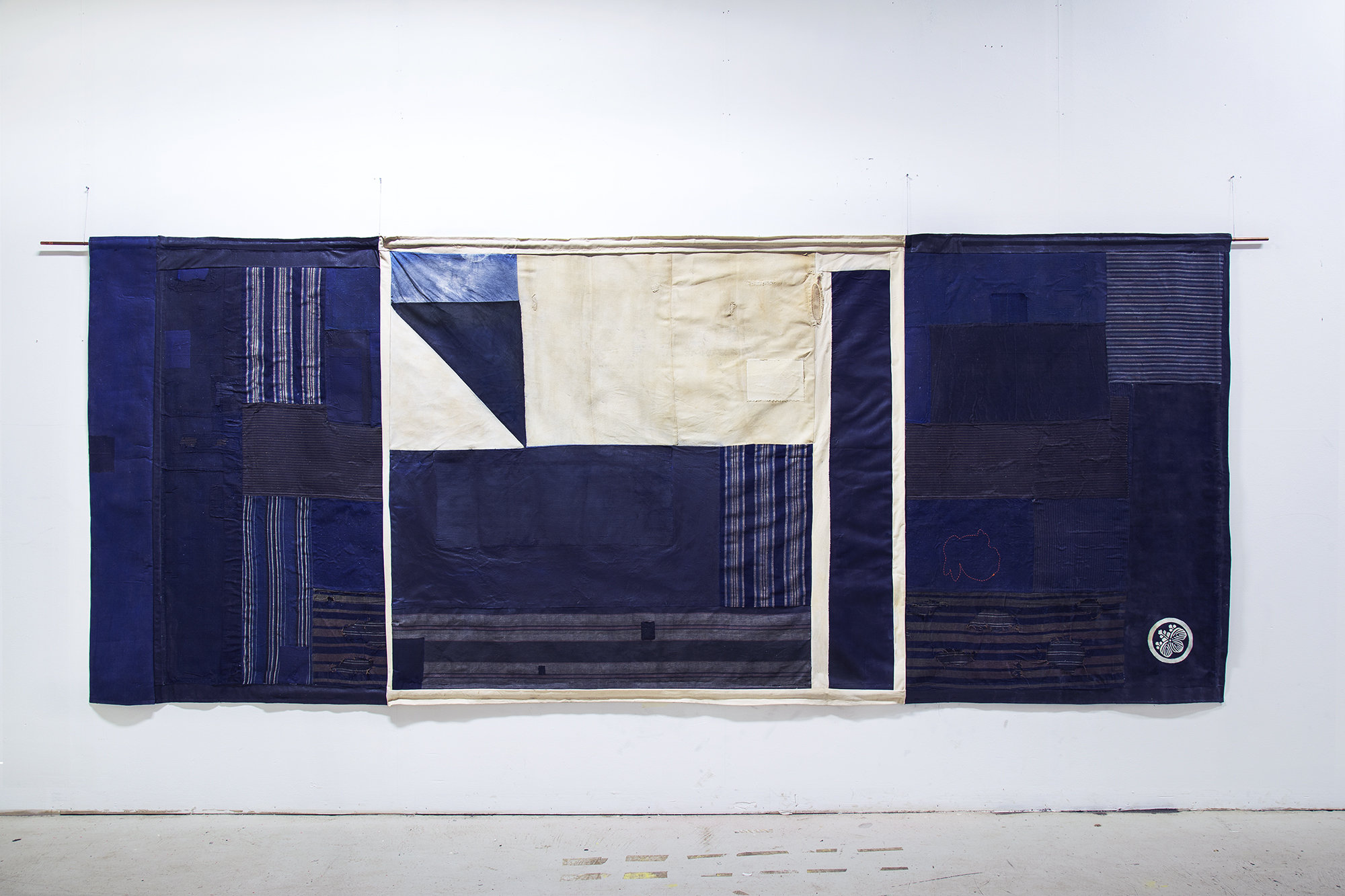 In Praise of Shadows (Tapestry), 2019. Bomullscanvas, linne, benlim, indigotyg, färgning, pärlemorpigment, sprayfärg, 160 x 420cm