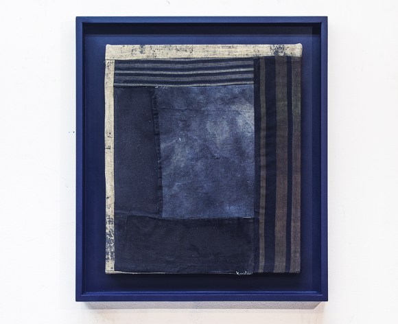 In Praise of Shadows IV, 2019. Linne, benlim, indigotyg, färgning, olja, sprayfärg, pärlemorpigment, träram, 64 x 57 x 6cm
