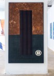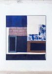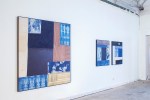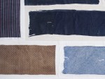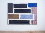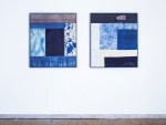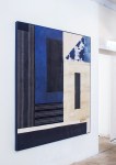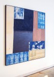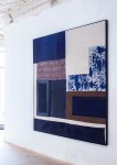 - Untitled (Indigo), 2018. Oil, bone glue, gesso, dye, Indigo fabric, Kimono fabric, pearlescent pigment on cotton canvas in lacquered wood frame, 211 x 186 x 4cm