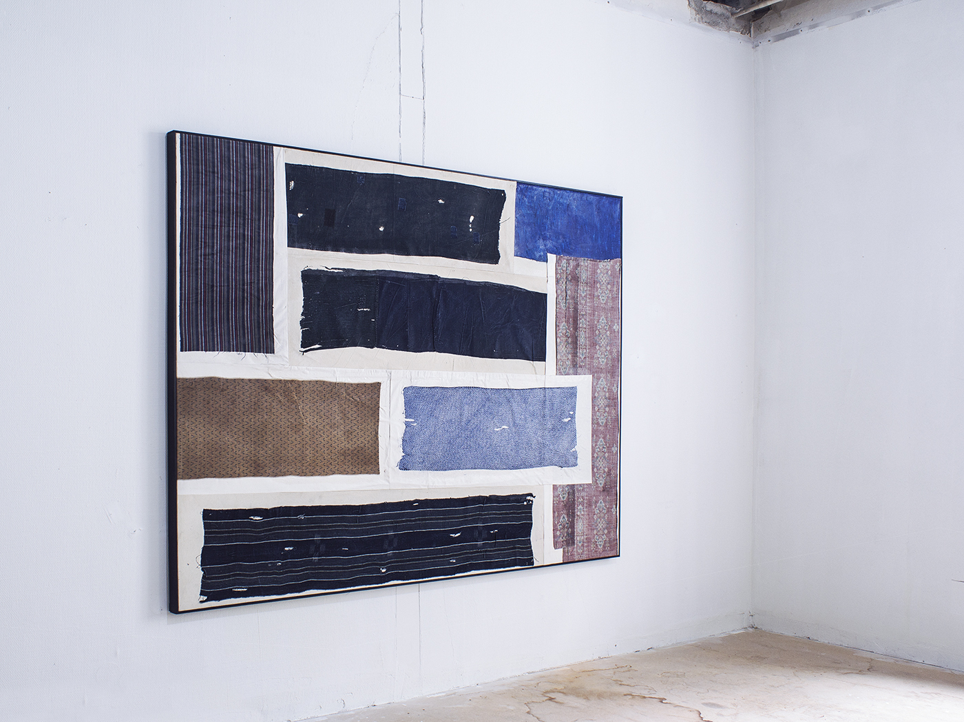 Untitled (Nippon), 2017 Oil, spray paint, bone glue, gesso, Indigo fabric, Kimono fabric, pearlescent pigment on cotton canvas in lacquered wood frame, 225 x 170 x 4cm