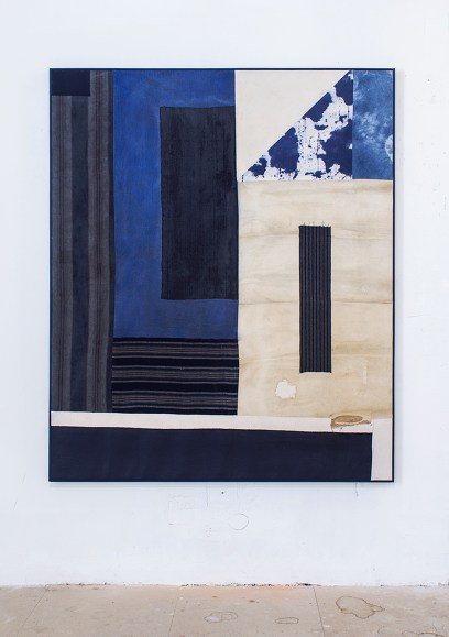 Untitled (Aizome), 2018 Oil, bone glue, gesso, dye, Indigo fabric, Kimono fabric, pearlescent pigment on cotton canvas in lacquered wood frame