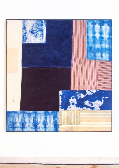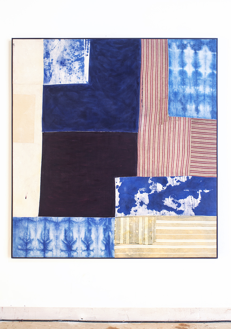 Untitled (Square), 2018 Oil, bone glue, gesso, dye, Indigo fabric, Kimono fabric, washi paper, pearlescent pigment on cotton canvas in lacquered wood frame, 165 x 152,5 x 4cm