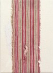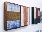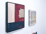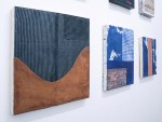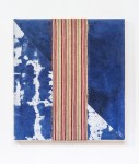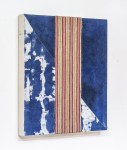 - Red Stripes/Diagonal Blues, 2018. Dye, pearlescent pigment, tread, glue, vintage fabric, oil on cotton canvas, 42,5 x 38,5 x 3cm