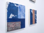 - (from left) Maroon & Prussian Blue, 2018. Pearlescent pigment, glue, spray paint, oil, vintage fabric, washi paper on cotton canvas, 42,5 x 34,5 x 4cm