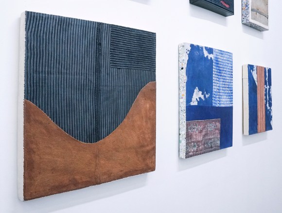 (From left) Wave, 2018 Vintage fabrics, glue, cotton stripe, 55 x 51 x 3cm