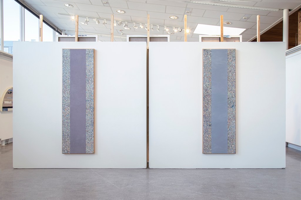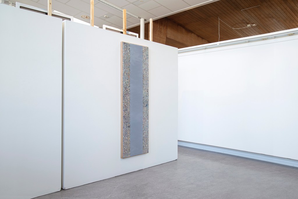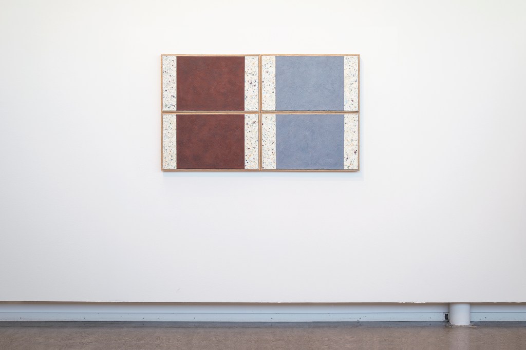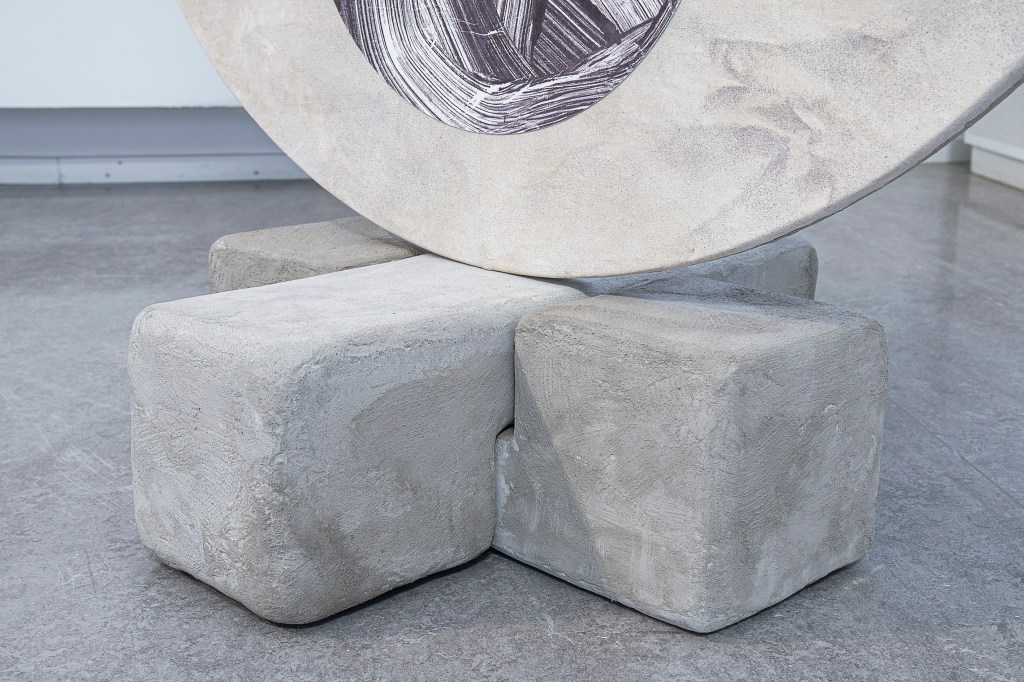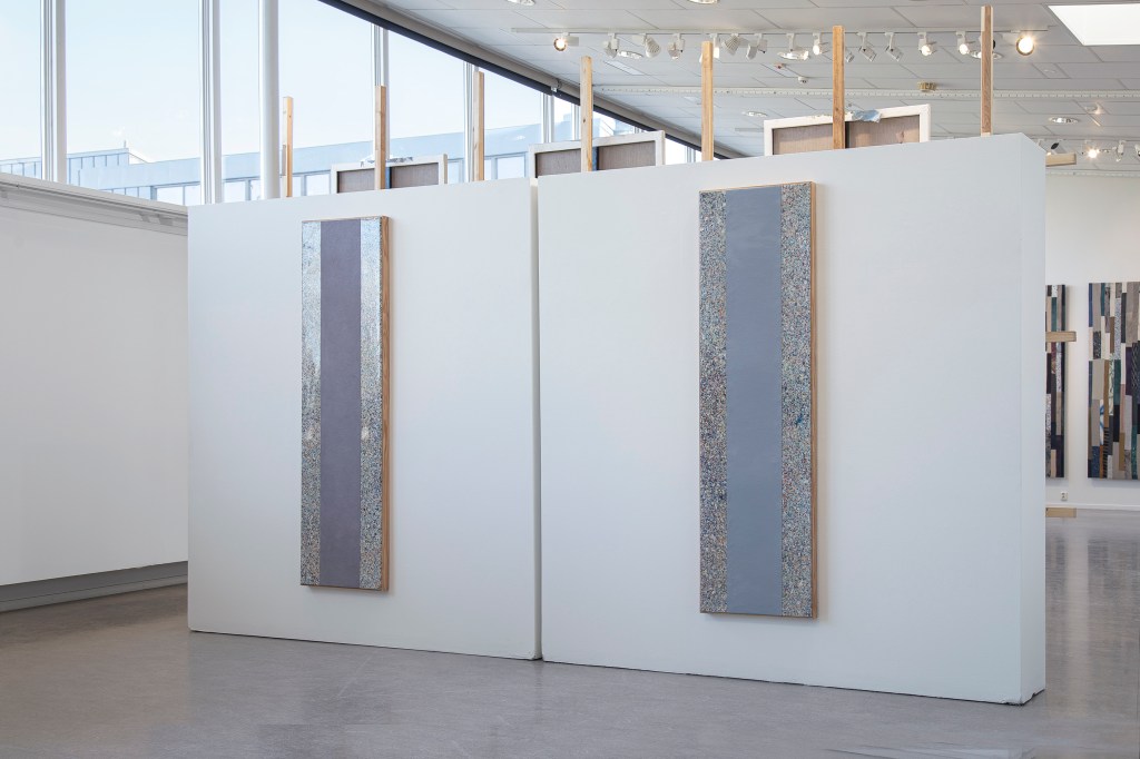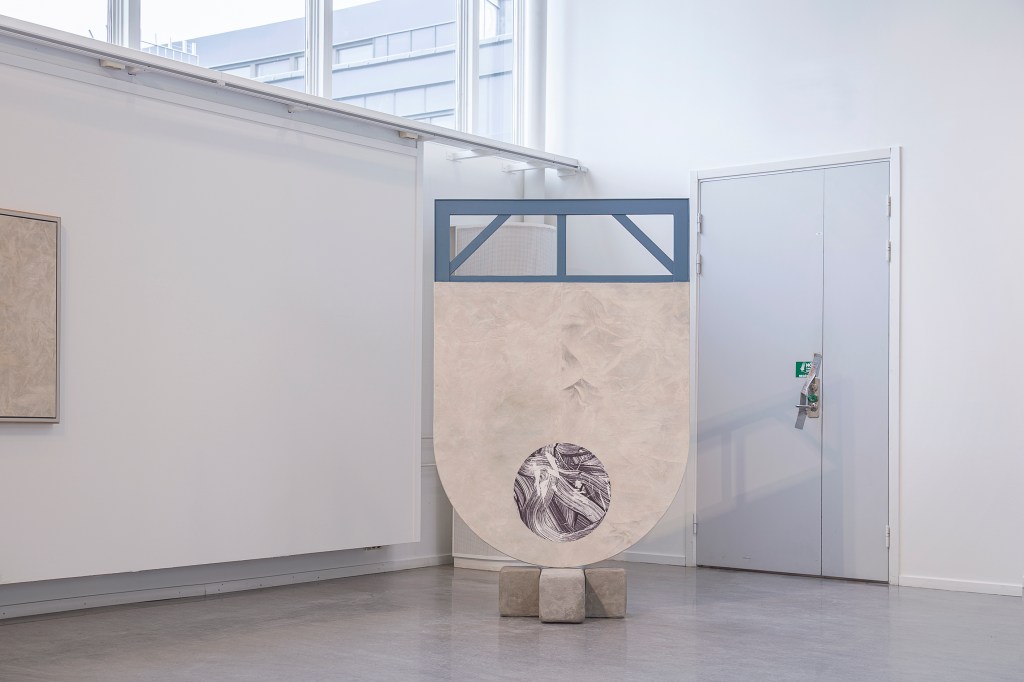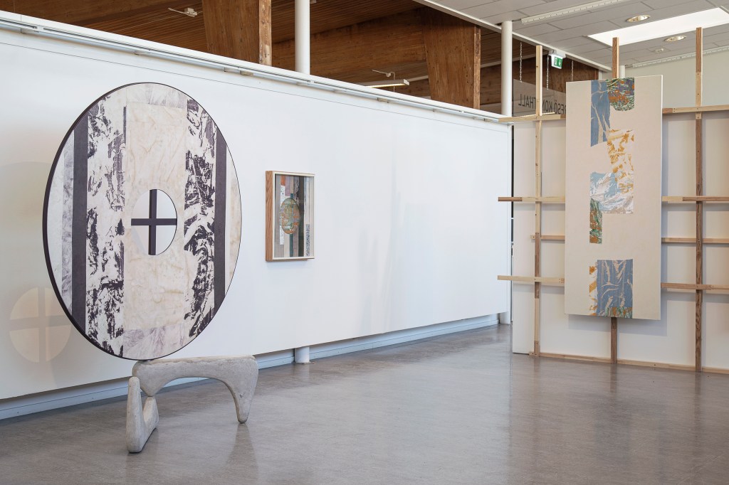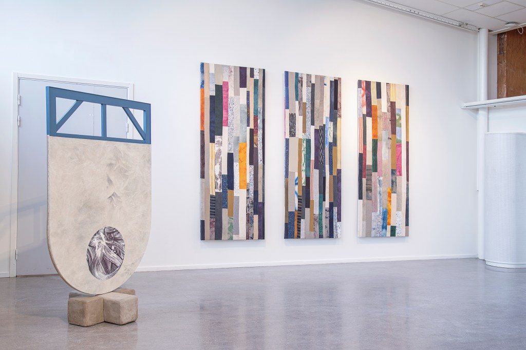 Inspiration från det arkitektoniska med dess material och enkla, geometriska former har varit en bidragande del i verkens utformning och funktion. De ”rastrerade” canvasdukarna av återanvänt material blir som ett heltäckande mosaik av olika färger och strukturer över ramkonstruktionerna. Verken tycks balansera av lätthet på skulpturer ute i rummet likt verket Untitled (Balance). Hämtat från en klassisk, modernistisk möbel, har bordsbenen klätts om i rå betong och blivit en bärande konstruktion för målningen. Med transparens och förskjutningar samspelar det hybrida verket med Tyresö konsthalls befintliga arkitektur och rum.