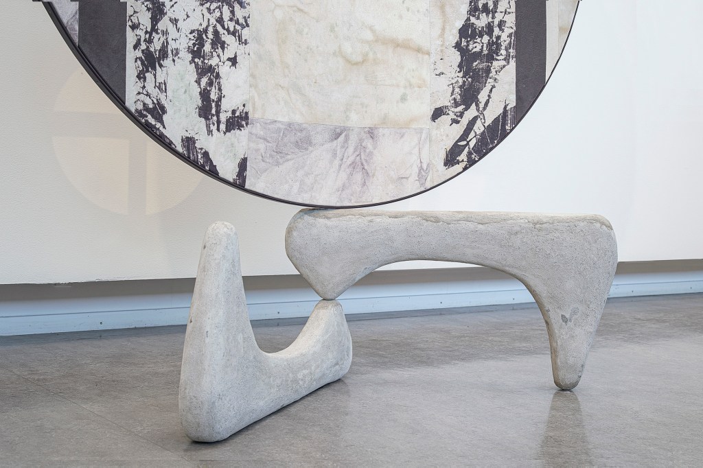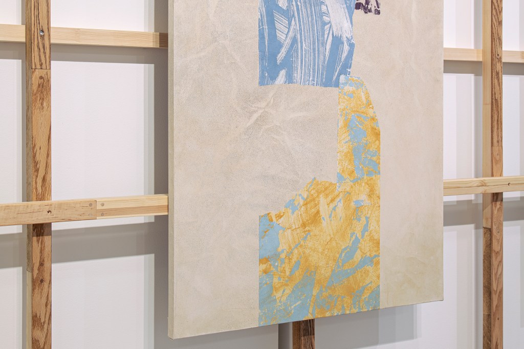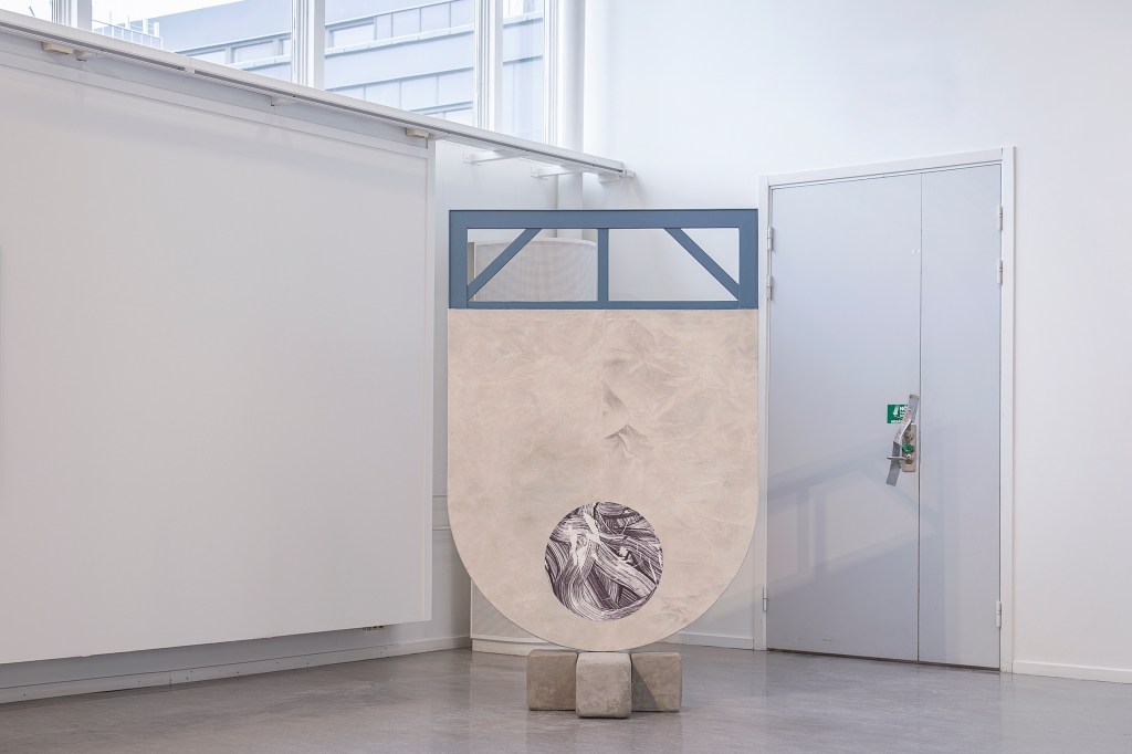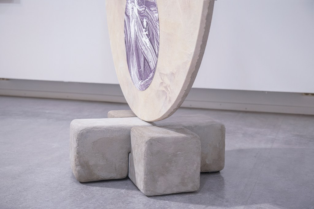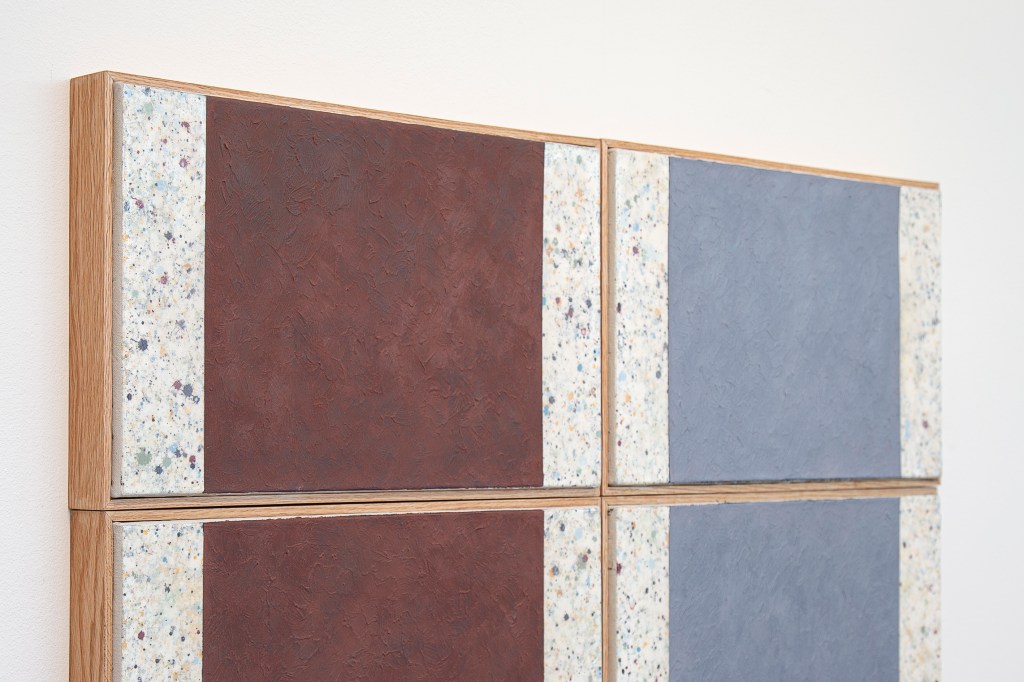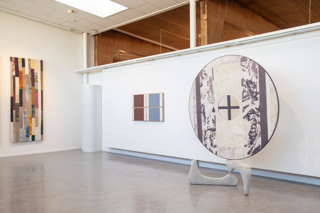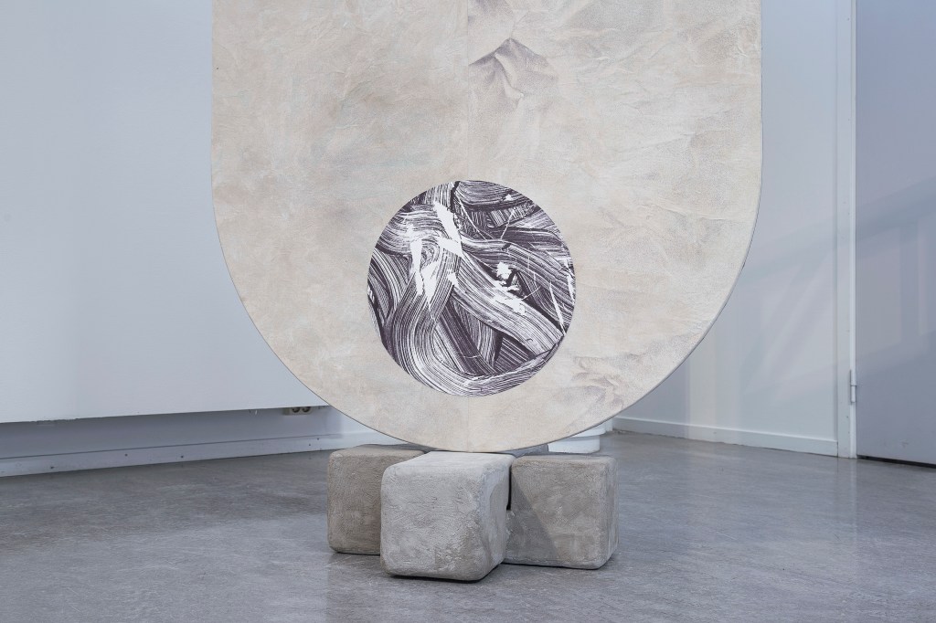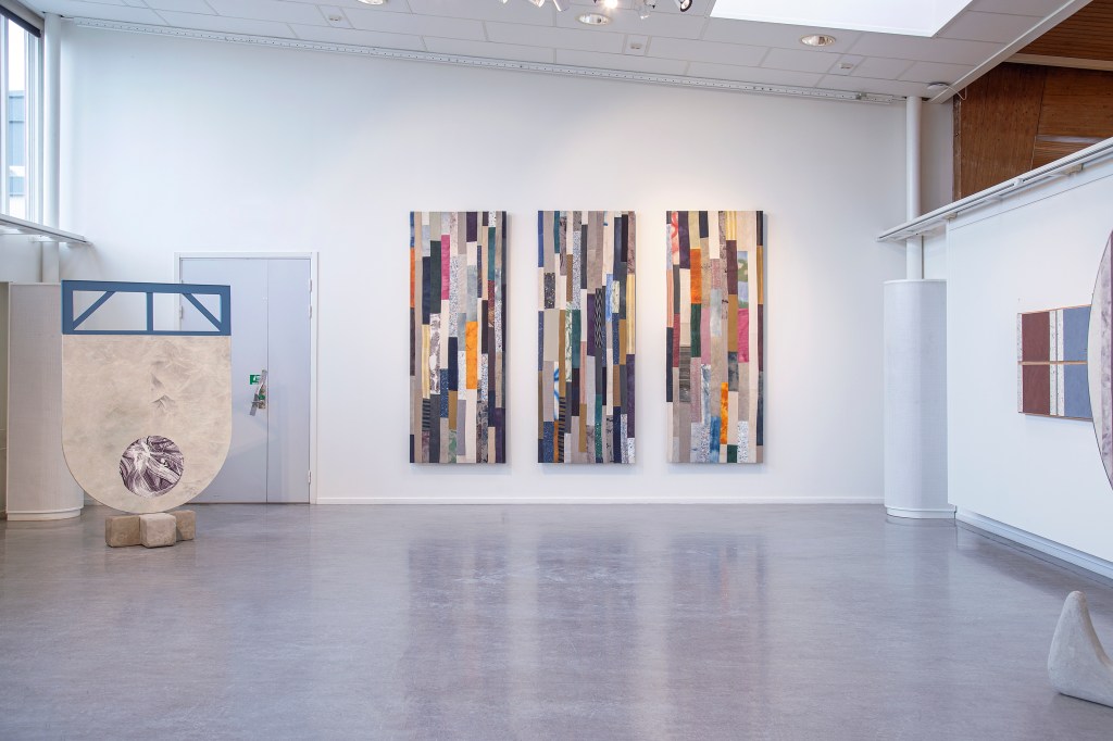 Inspiration från det arkitektoniska med dess material och enkla, geometriska former har varit en bidragande del i verkens utformning och funktion. De ”rastrerade” canvasdukarna av återanvänt material blir som ett heltäckande mosaik av olika färger och strukturer över ramkonstruktionerna. Verken tycks balansera av lätthet på skulpturer ute i rummet likt verket Untitled (Balance). Hämtat från en klassisk, modernistisk möbel, har bordsbenen klätts om i rå betong och blivit en bärande konstruktion för målningen. Med transparens och förskjutningar samspelar det hybrida verket med Tyresö konsthalls befintliga arkitektur och rum.
