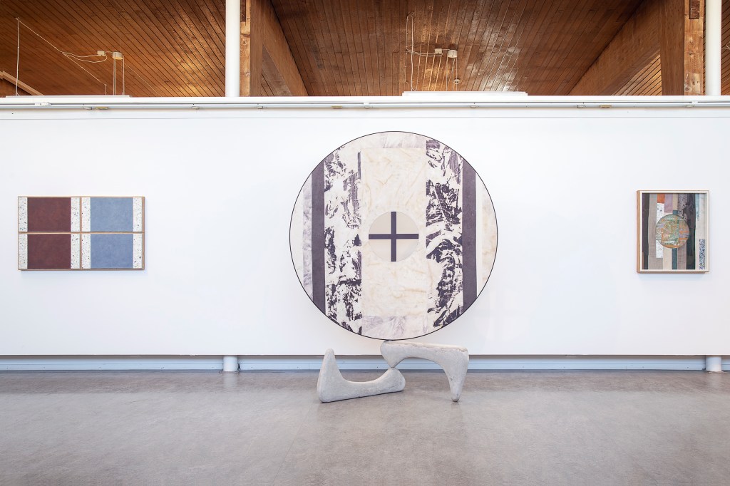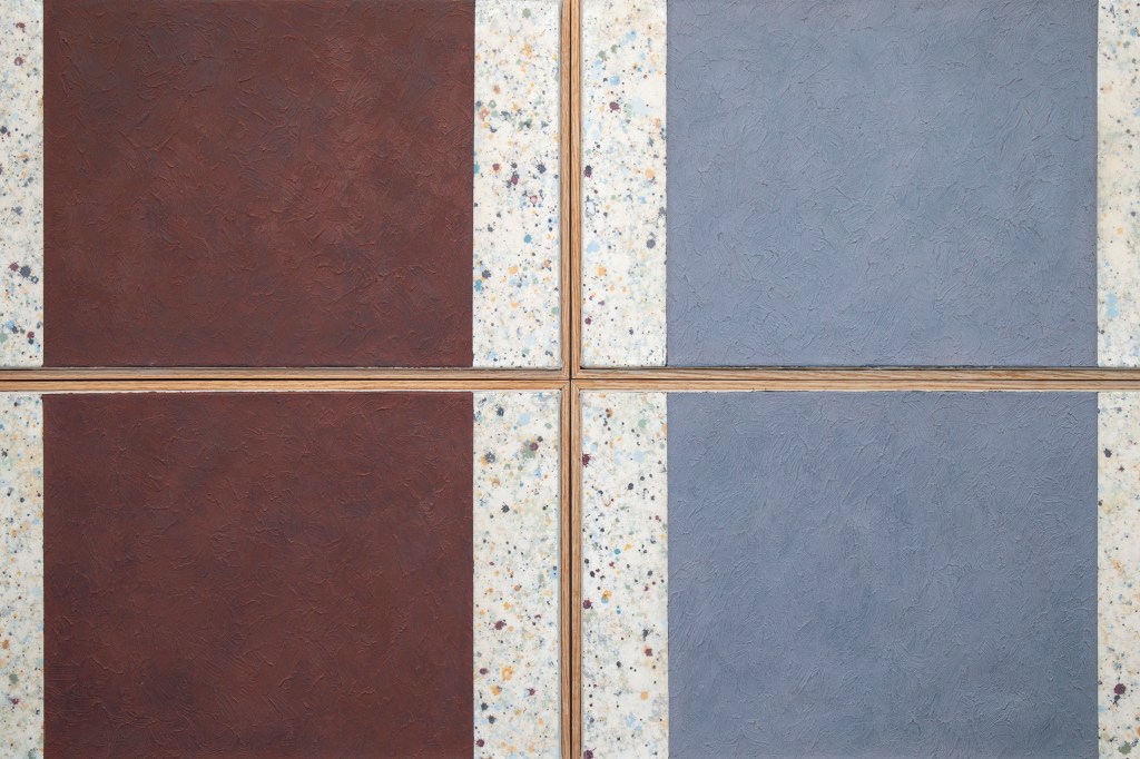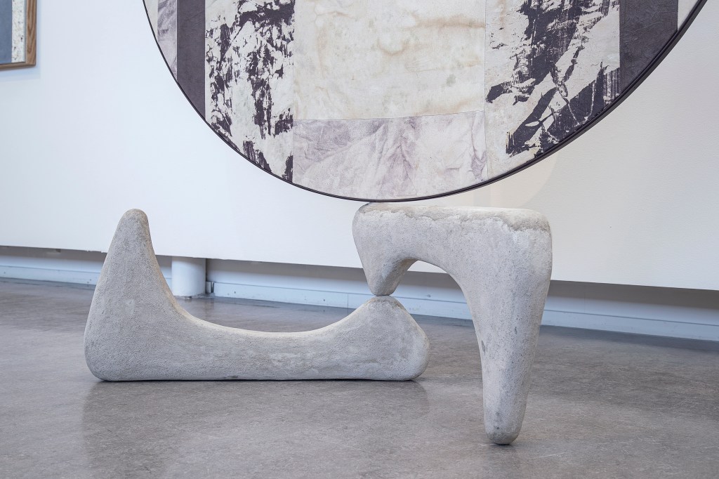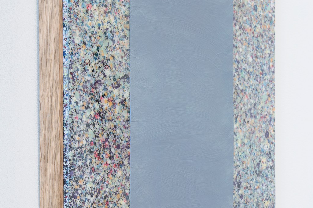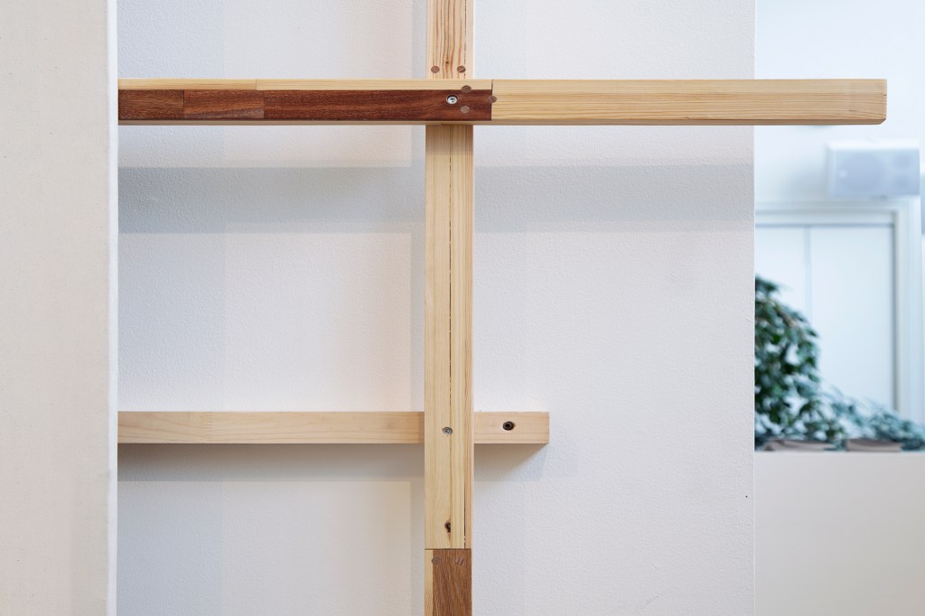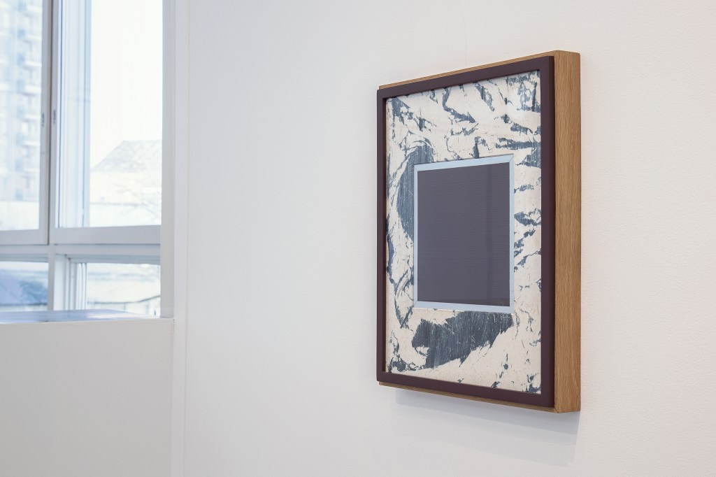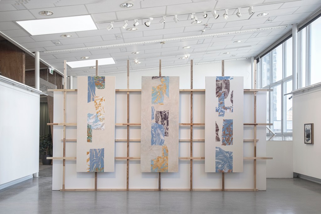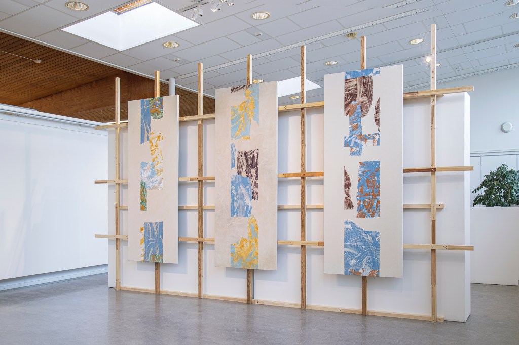 Inspiration från det arkitektoniska med dess material och enkla, geometriska former har varit en bidragande del i verkens utformning och funktion. De ”rastrerade” canvasdukarna av återanvänt material blir som ett heltäckande mosaik av olika färger och strukturer över ramkonstruktionerna. Verken tycks balansera av lätthet på skulpturer ute i rummet likt verket Untitled (Balance). Hämtat från en klassisk, modernistisk möbel, har bordsbenen klätts om i rå betong och blivit en bärande konstruktion för målningen. Med transparens och förskjutningar samspelar det hybrida verket med Tyresö konsthalls befintliga arkitektur och rum.