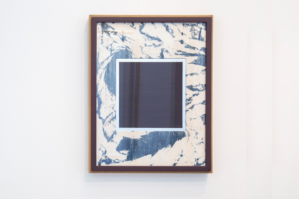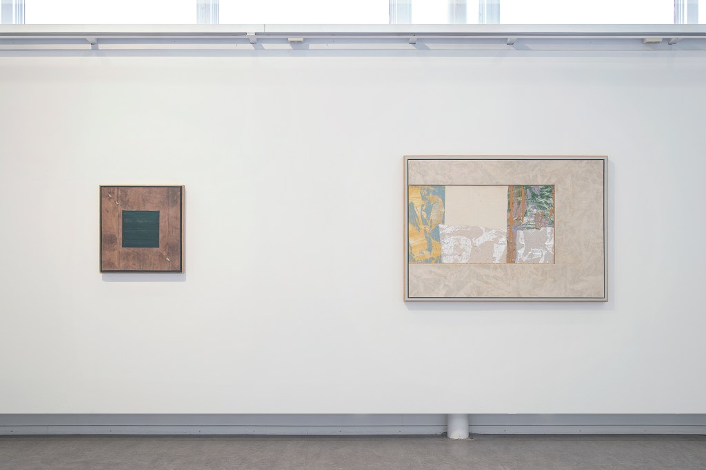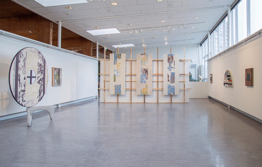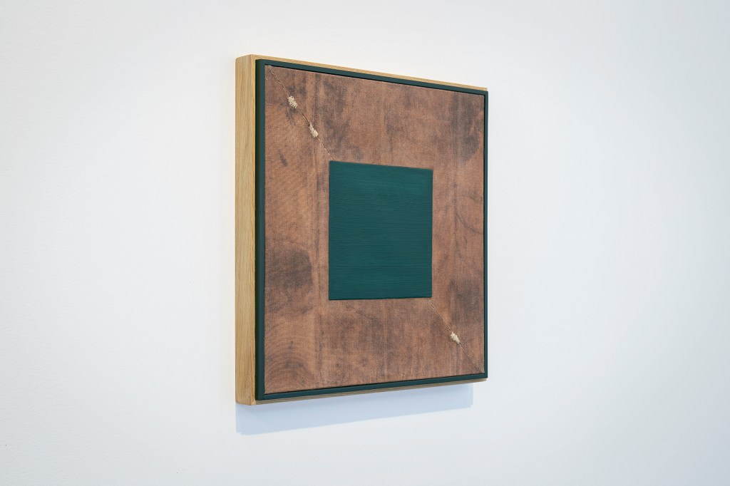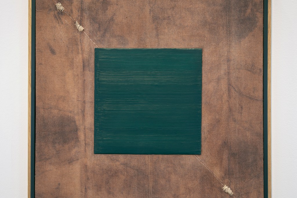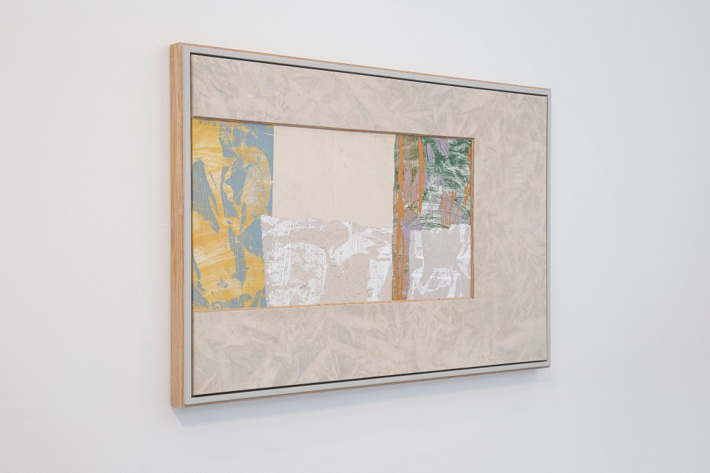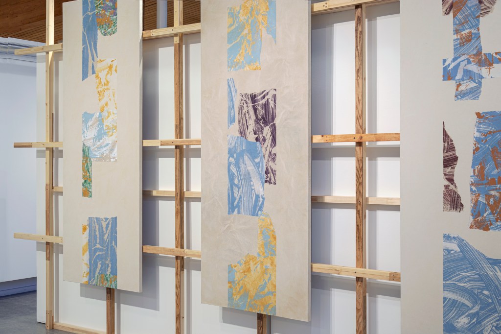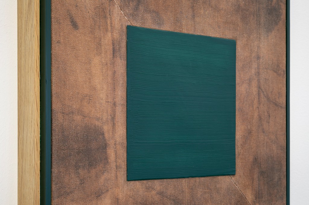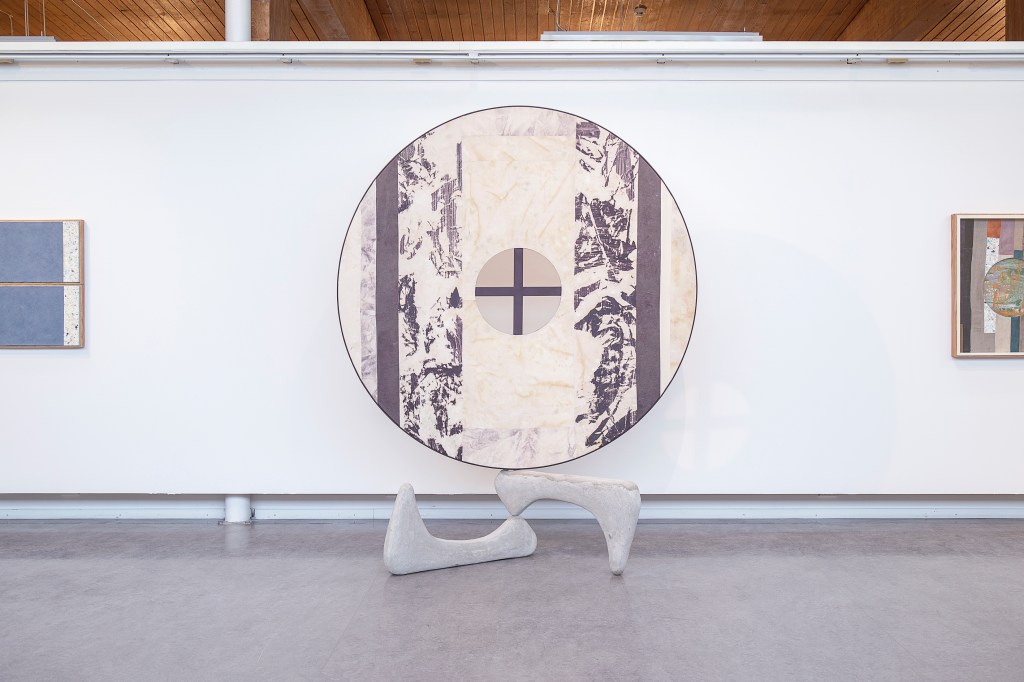 Inspiration från det arkitektoniska med dess material och enkla, geometriska former har varit en bidragande del i verkens utformning och funktion. De ”rastrerade” canvasdukarna av återanvänt material blir som ett heltäckande mosaik av olika färger och strukturer över ramkonstruktionerna. Verken tycks balansera av lätthet på skulpturer ute i rummet likt verket Untitled (Balance). Hämtat från en klassisk, modernistisk möbel, har bordsbenen klätts om i rå betong och blivit en bärande konstruktion för målningen. Med transparens och förskjutningar samspelar det hybrida verket med Tyresö konsthalls befintliga arkitektur och rum.