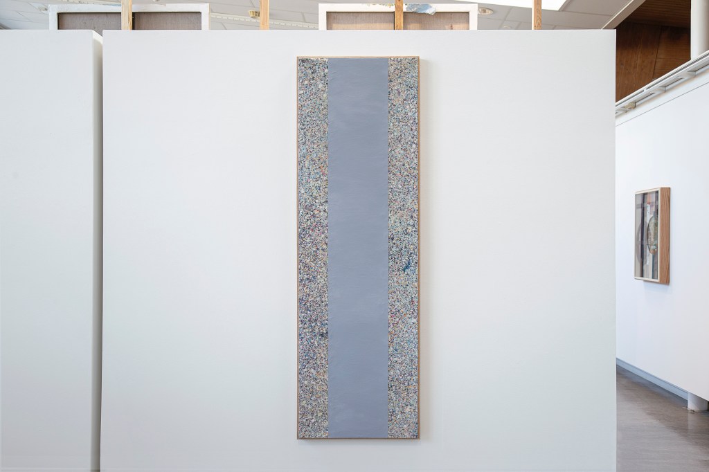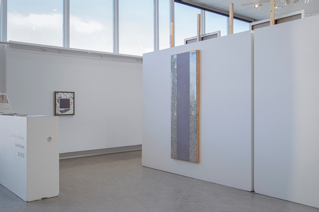 Detta till synes meningslösa och tidskrävande arbete har varit en stor del i processen av Studio Detox, för Näsman är de presenterade verken nästintill sekondära i betydelsen för utställningens kontext. Likt en spaljévägg installeras de stora verken vertikalt och letar sig högre upp mot takrymden och blir därmed en tydlig del av presentationen. Näsmans verk förhåller sig till materialens möjligheter genom att låna från det repetitiva och standardiserade hantverket i ett försök att utmana måleriets begränsningar, både på själva bildplanet och ute i rummet.