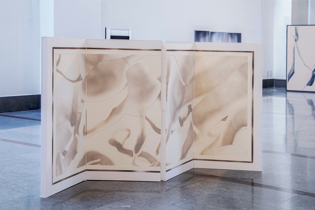 The Swedish artists participating in the project have been carefully selected based on the character of their respective practices and the potentiality for an interesting meeting with the form and tradition of the Japanese folding screen. The work of Inez Jönsson, Karl Patric Näsman and Ylva Carlgren strongly relate to a sense of craftsmanship, in their choice of material and in their repetitive, time-consuming and meticulous methods. Similarly, there is a relation between the work of Juri Markkula and Martin Kozlowski. The digital aesthetic and industrial manufacturing process of Markkula by using different machines and tools meets Kozlowski’s analogue paintings on canvas and paper, informed by a layering technique that finds inspiration in digital image editing.